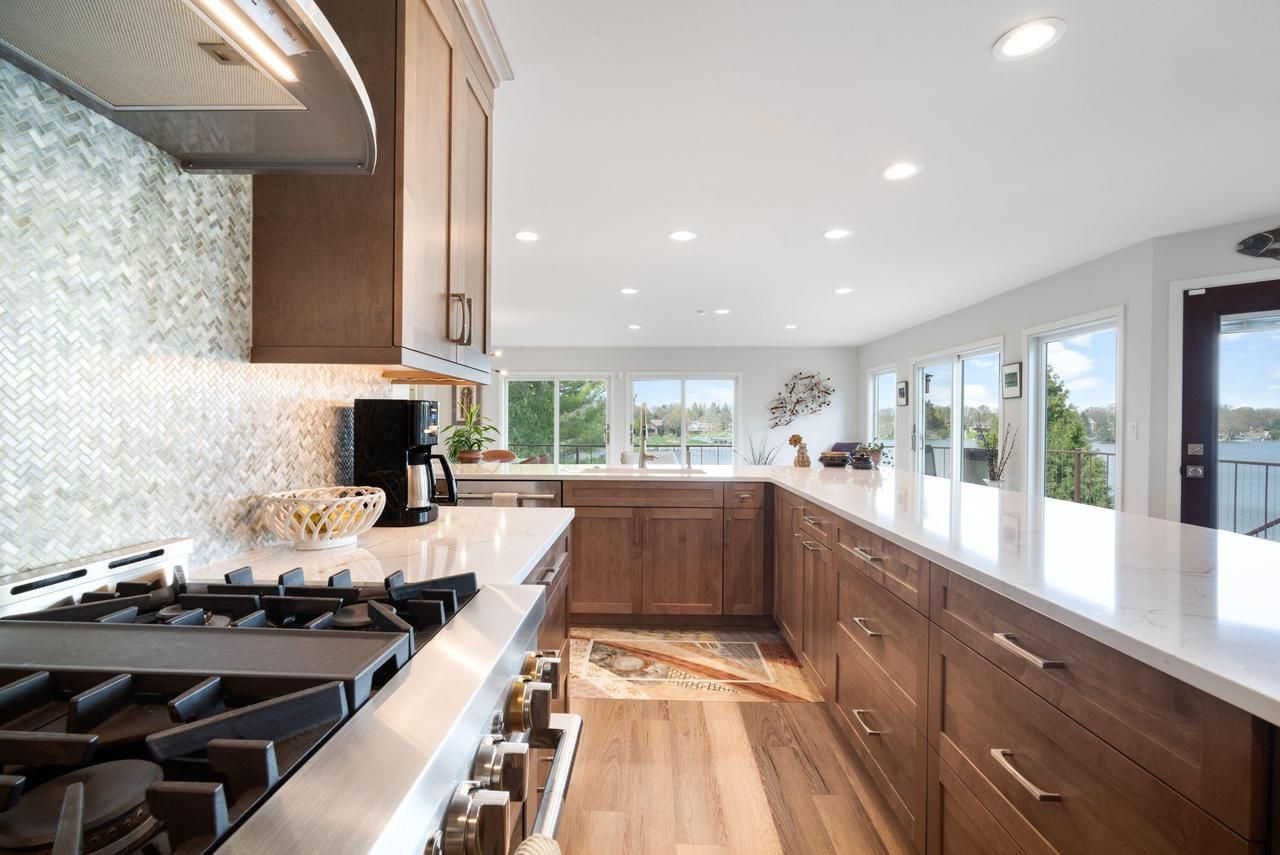 Torn down and re built in 1994 w/ recent remodel inside and out done by Groskopf Construction. Incredible lake views w/ over 100 ft of frontage. Gourmet kitchen w/quartz, custom tile, luxury slow close cabinets and high end appliances. Open concept w/living rm open to dining rm w/builts ins. Main floor master suite w/luxurious bth and WIC. 2nd floor large bedrm adjacent to 1/2 bth. Back hall w/private entry to garage & custom built ins. Open staircase leads to full walk out LL featuring family rm w/GFP, gorgeous wet bar w/seating. Open concept flow to bonus area. Full bth w/stunning finishes. 3rd bedrm located on LL. Loads of storage! 2 all year piers, functioning boat house w/roof seating. Lush lot w/water feature. Composite wrap around deck plus lower patio! Welcome to your new home!